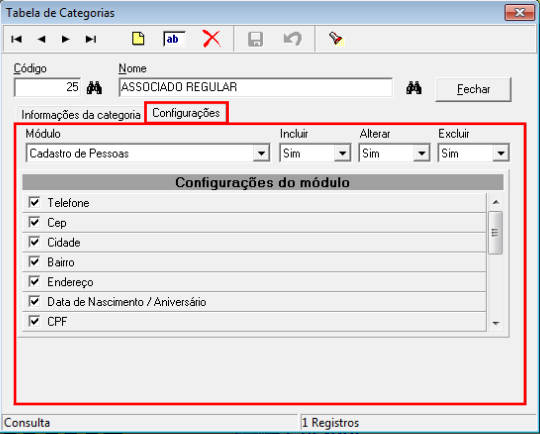 Tela onde é feita a configuração da categoria para obrigatoriedade dos campos e permissão de inclusão, alteração e exclusão.