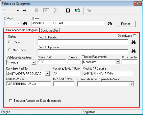 Validar Data Controle na Entrada (Essa opção marcada, o sistema irá validar sempre no acesso do sócio desta categoria, se a data de acesso e menor ou igual a data de controle)