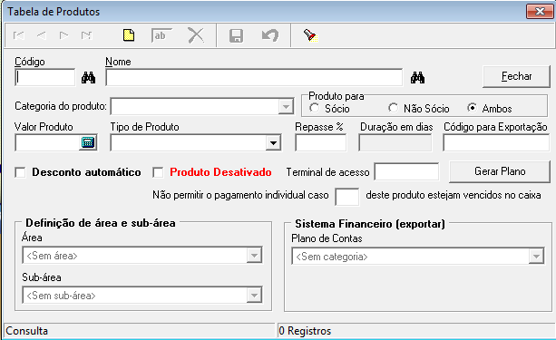 SISTEMA FINANCEIRO (EXPORTAR): Campo onde pode ser definido para qual plano de contas ou categoria e sub-categoria do financeiro este produto terá vinculo no sistema Financeiro.